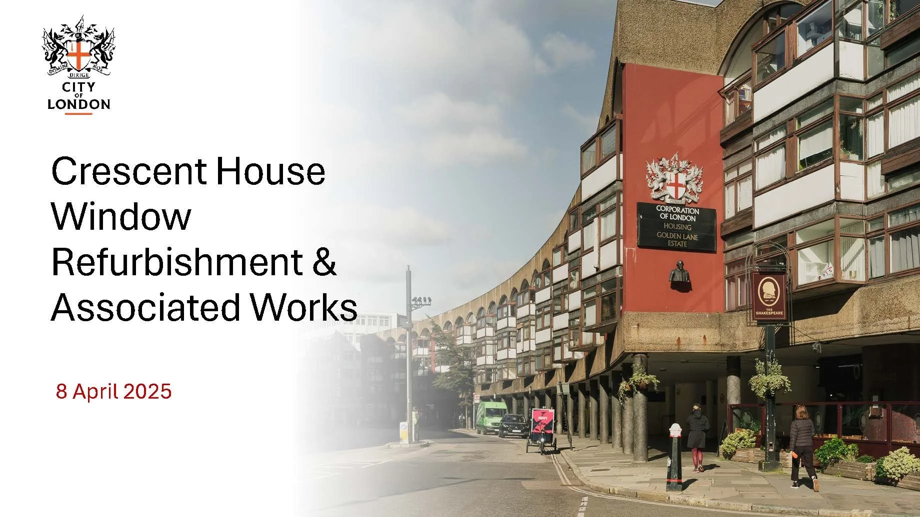 Thank you to all those who attended the Community Meeting on Tuesday 8 April where the project team shared an update on the Golden Lane Estate Investment Programme for Crescent House residents. Please use the video link to watch the recording and click on the links below to view the presentation slides and notes, the indicative timeline and a Higher Risk Building (HRB) factsheet.